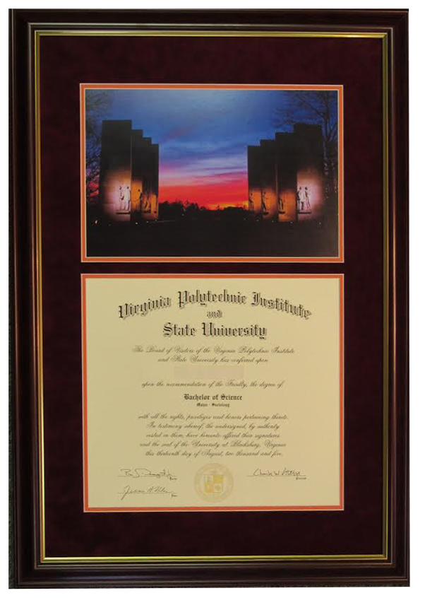 The Elegant Suede Combo #10 $299.95 Mahogany finish wood frame with gold lip, VT maroon suede and orange, multi-opening archival quality matting and backing, regular glass, wire hanger and bumpers on the back, wall hanger included, Picture of your choice for the top opening.