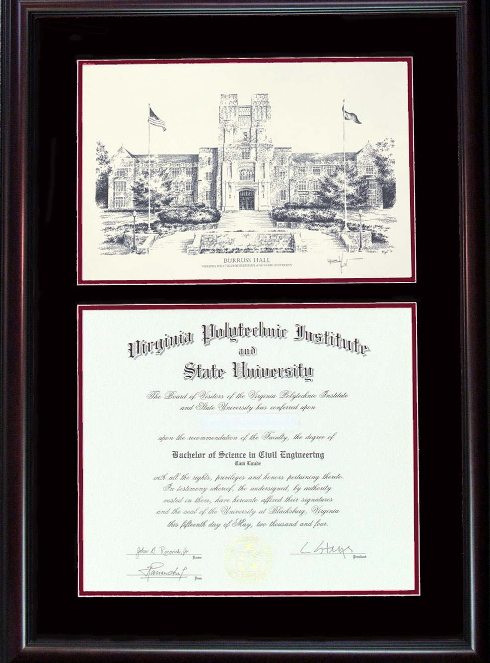 The Professional Combo #6 $224.95 Mahogany finish wood frame with VT black and maroon multi-opening mat, archival matting and backing, regular glass, wire hanger and bumpers on the back, wall hanger included as well as the picture of your choice for the top.